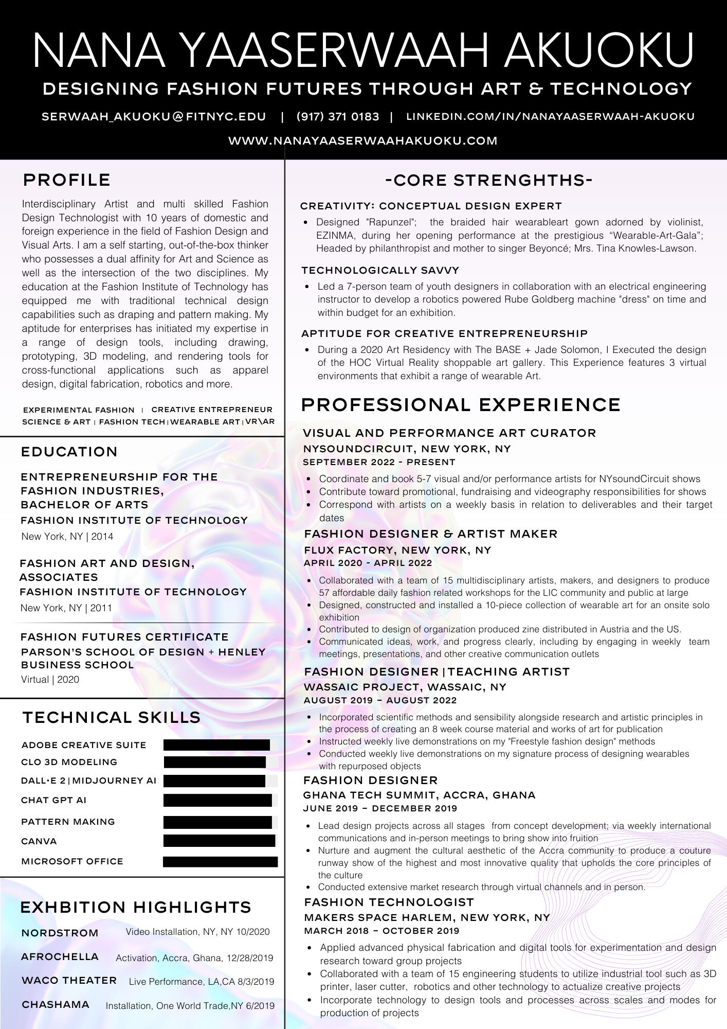 Akuoku is an Alumna of the Fashion Institute of Technology with majors in Fashion Design and also in Entrepreneurship for the design industry.